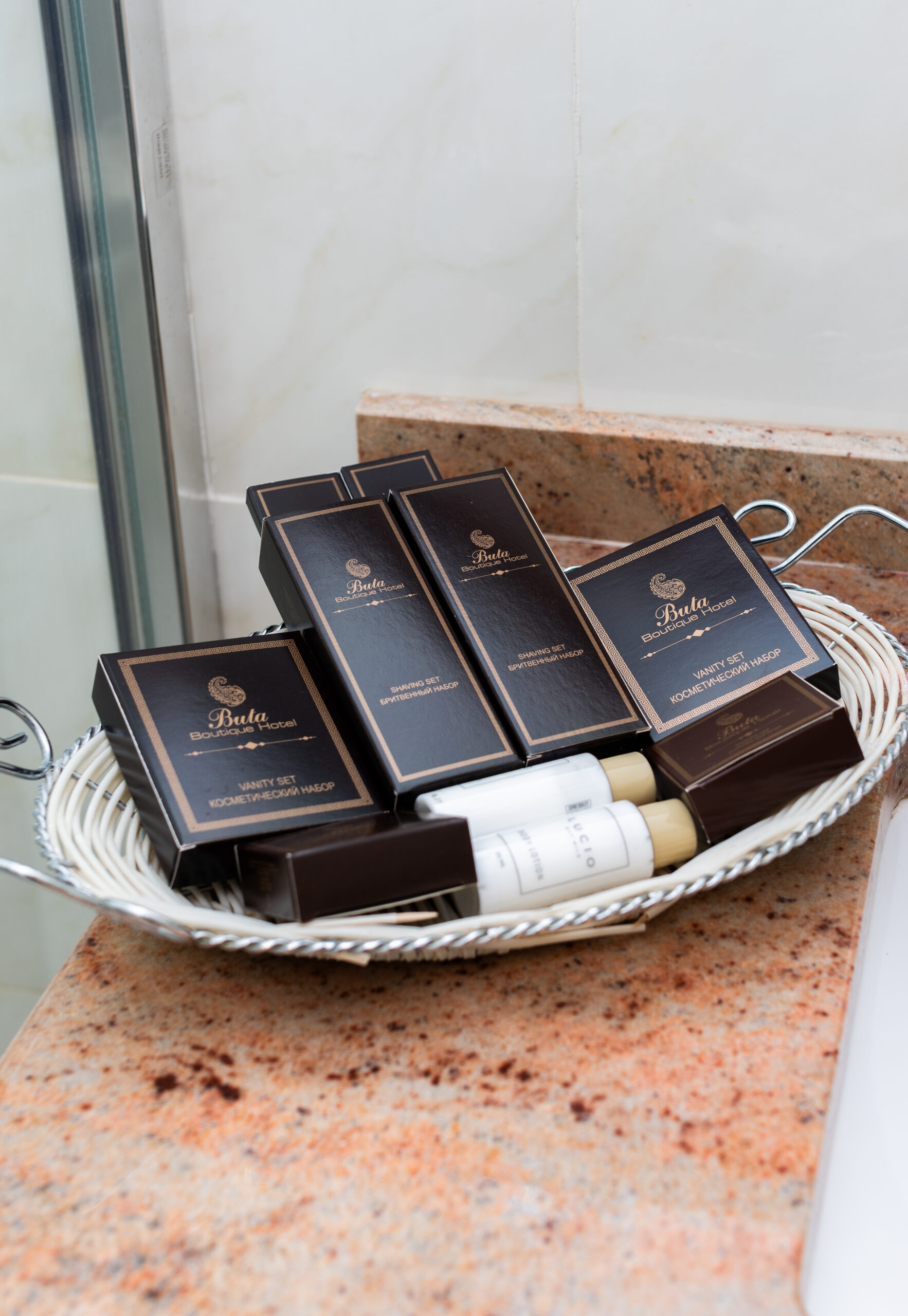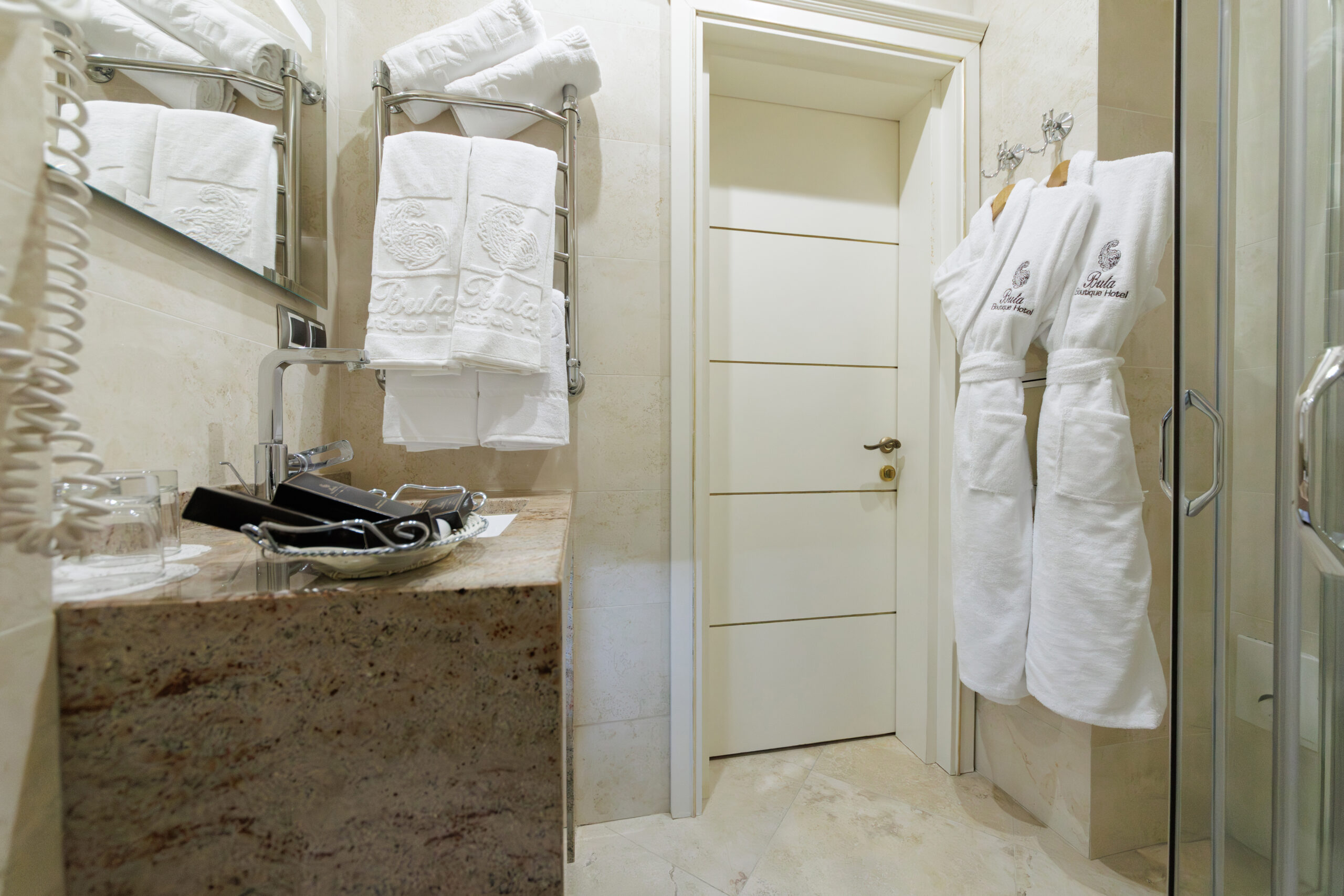 - Комплект полотенец, халат, тапочки
